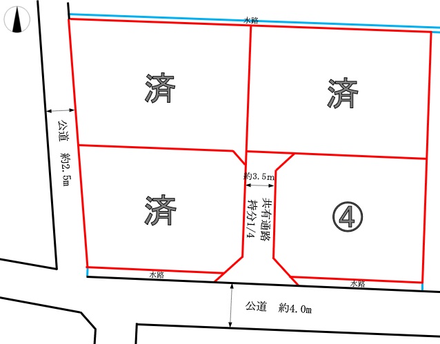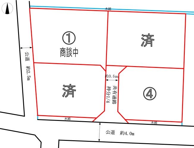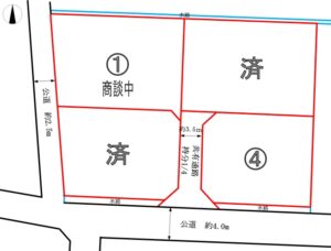 | 備考 | ・②④区画は法43条許可が必要です ・①③区画は西側道路後退、①②区画は北側水路後退が必要です ・③区画に電柱、②区画に電柱及びその支線が建つ予定です |