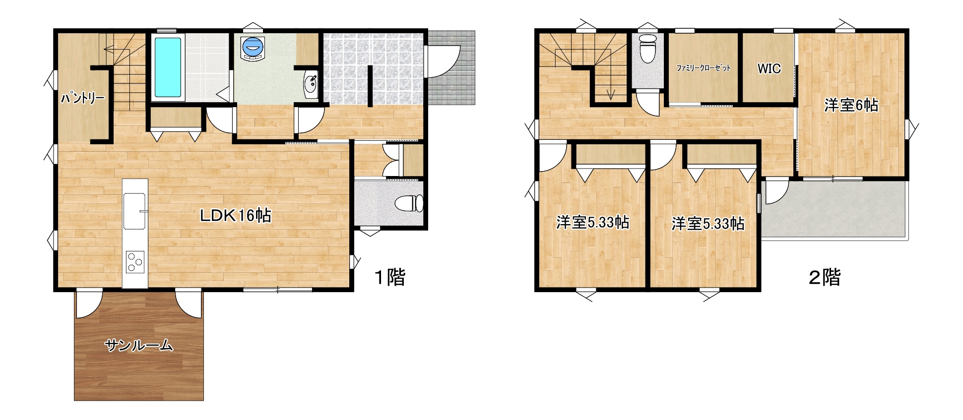 玄関が広く、パントリーやファミクロ、サンルームなどなど充実した間取り♪