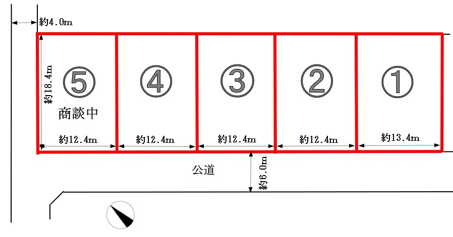 | 備考 | ・⑤区画内に消火栓、ホース格納箱あり ・電柱計画未定 ・実測未了。計画面積と異なる可能性があります |