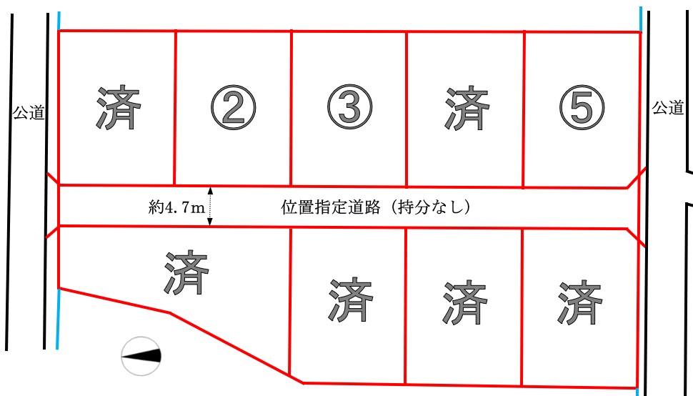 接道状況 北側公道、南側公道、私道(位置指定道路持分なし)